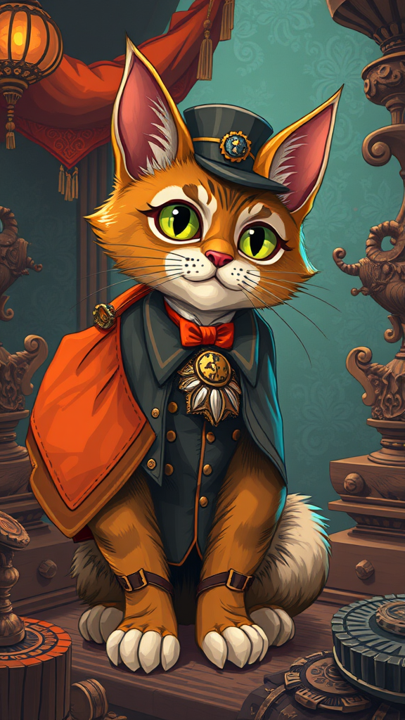 A whimsical illustration of a gentleman cat in 2D game art style, featuring a cyan and burnt orange color scheme. The cat exudes a necropunk vibe, surrounded by intricate tapestries and wooden elements. The artwork radiates fancy and whimsical elegance, with an adventurous flair. The scene is in ultra-high definition, capturing every detail, and the proportions follow a 2:3 aspect ratio. With a touch of creative chaos, it emphasizes the cat's charismatic personality, incorporating elements like steampunk accessories and a playful background with hints of magical realism.