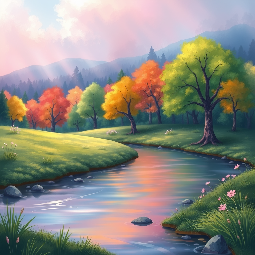 A whimsical illustration of a serene landscape that exudes tranquility and calm, featuring a vibrant, enchanted forest in the background with trees ablaze in a symphony of colors. In the foreground, a gentle river meanders gracefully, reflecting the soft glow of a pastel sky. The scene is painted in a fairy tale style, inviting a sense of magic and wonder.