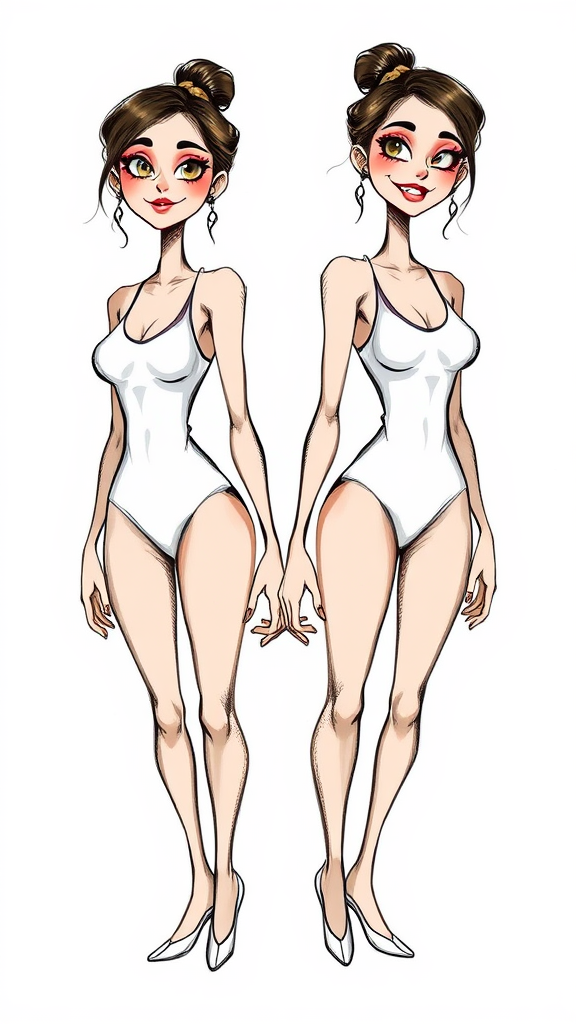 A whimsical illustration of a woman in a leotard set against a plain white background, created in the style of AshleyCipher art. The image features a blend of sketch and 3D elements, with a touch of cartoonish animation. The woman, rendered with exaggerated expressions and vibrant makeup, appears in duplicate but with a playful twist of slight deformity. Her limbs are elongated or abstractly shaped, lending a child-like charm to the entire scene. Despite the quirky details, the composition retains a cohesive and imaginative feel.