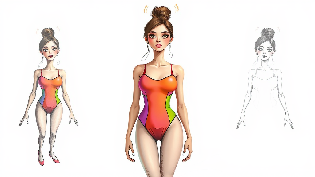 A whimsical illustration of a woman in a vibrant leotard against a simple white backdrop, inspired by the styles of Evalyn_Noexist and AshleyCipher. The composition blends realistic sketching with 3D elements, featuring duplicate figures, playful deformities, and exaggerated makeup, evoking a cartoonish and animated feel. Rendered with childlike charm, the artwork displays missing limbs and other fantastical features, creating an imaginative and lighthearted scene.