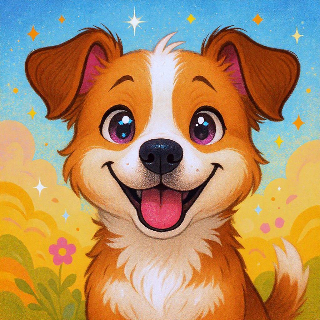 A whimsical illustration of an adorable dog with bright, sparkling eyes and a cheerful grin, radiating joy as it gazes warmly at the viewer, set against a playful, colorful background that enhances the cartoonish charm.
