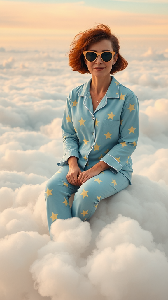 A whimsical image depicting an eccentric woman perched atop soft, cottony clouds, donned in light blue pajamas adorned with cheerful yellow stars. Her oversized sunglasses add a touch of playfulness, and her short, curly bob of rich auburn hair flutters gently in the breeze. The backdrop is a serene expanse of pastel sky, filled with gentle, billowy clouds. The scene, captured in the signature style of Jimmy Marble, embraces muted earthy hues and subtle soft tones, lending it an ethereal and dreamlike quality.