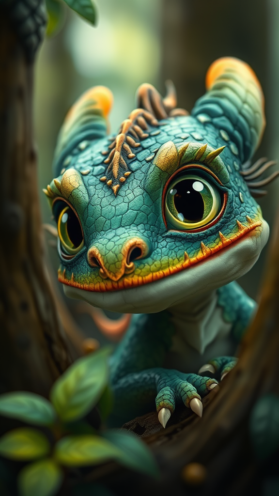 A whimsical, intricately detailed close-up of a baby dragon nestled among forest trees, its large green eyes shimmering with curiosity. The creature's scales exhibit a rich blend of teal and gold hues, with a texture that is both sharp and prickly. The scene captures the enchanting style of Paul Barson, enhanced by the vivid storytelling elements reminiscent of Kadir Nelson's work. The dragon's delicate features and the magical forest setting create a sense of wonder and fantasy, inviting viewers into a world where nature and myth intertwine.