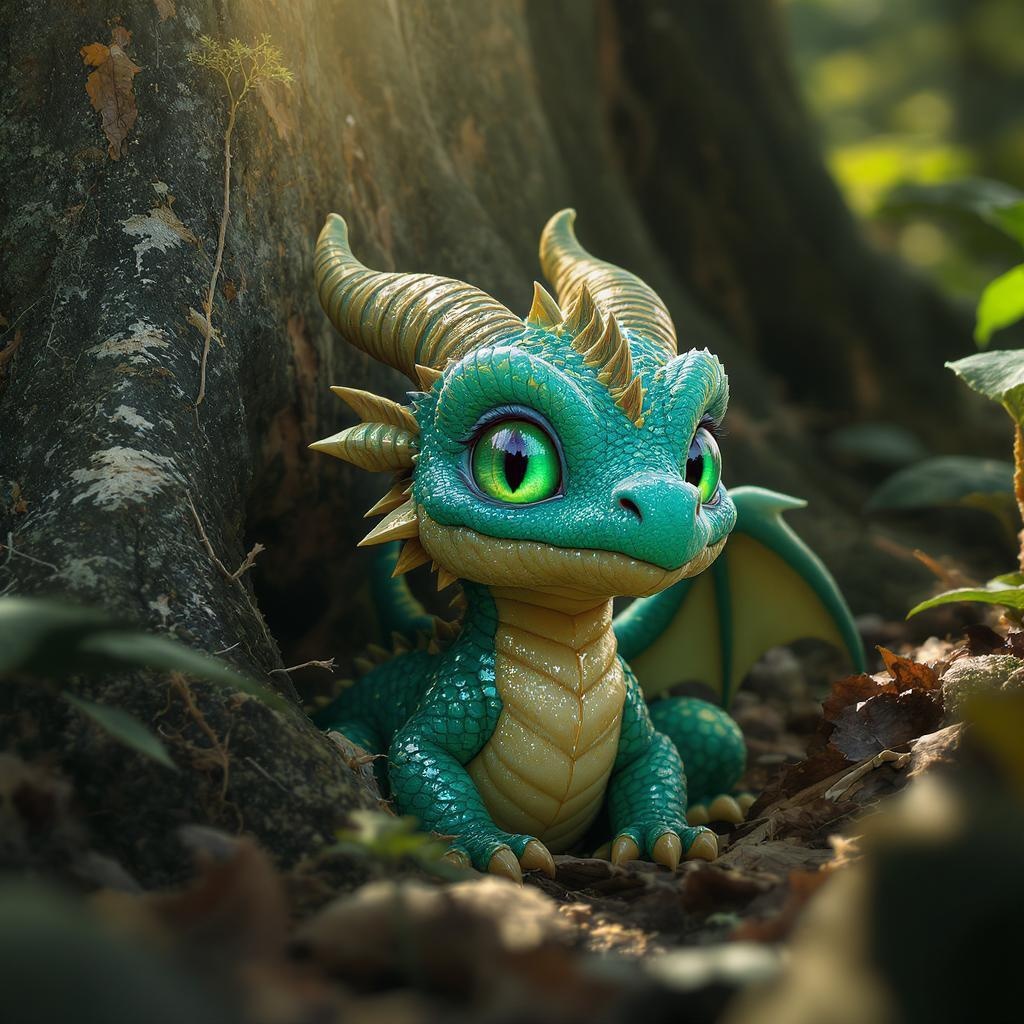 A whimsical, intricately detailed close-up of a baby dragon nestled in the forest near towering trees, its large green eyes sparkling with curiosity. The dragon's scales shimmer in shades of teal and gold, with a sharp, prickly texture reminiscent of a zbrush sculpture. The scene exudes the stylistic charm of Paul Barson and the pictorial elegance of Kadir Nelson, with an enchanting play of light filtering through the leaves, casting intricate shadows on the dragon's delicate features.