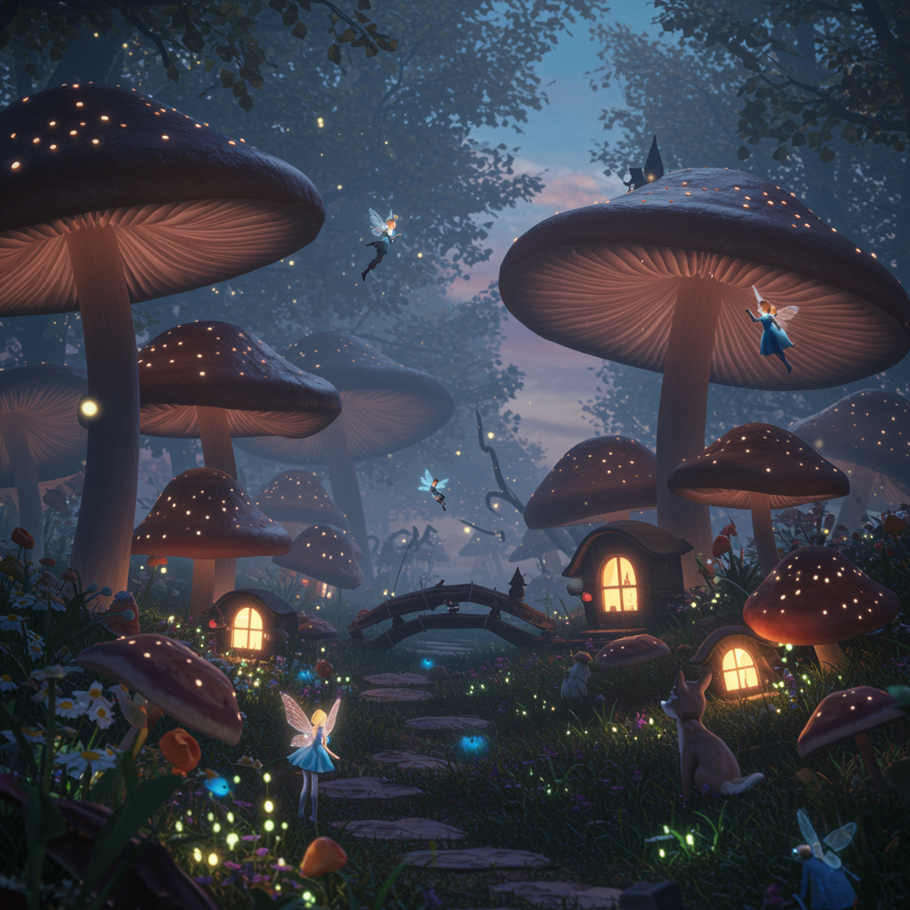 A whimsical journey through an enchanting forest where towering mushrooms glow under a twilight sky, inspired by Alice in Wonderland and classic fairy tales. The scene is brought to life with Unreal Engine and octane render, capturing the magic in a stunning 3D rendering. Delicate fairies with iridescent wings flit around, and charming woodland creatures peek out from behind vibrant flowers. The atmosphere is dreamlike and awe-inspiring, with touches of cuteness and wonder, meticulously enhanced with Adobe Photoshop to create a beautifully surreal landscape.