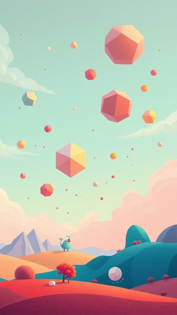 A whimsical landscape of floating geometric shapes and vibrant colors, evoking childlike curiosity as they dance in a sky of pastel hues; dreamlike scenes unfold with abstract forms resembling fantastical creatures and impossible structures, all blending seamlessly in an ethereal tapestry of fluid motion and imaginative simplicity.