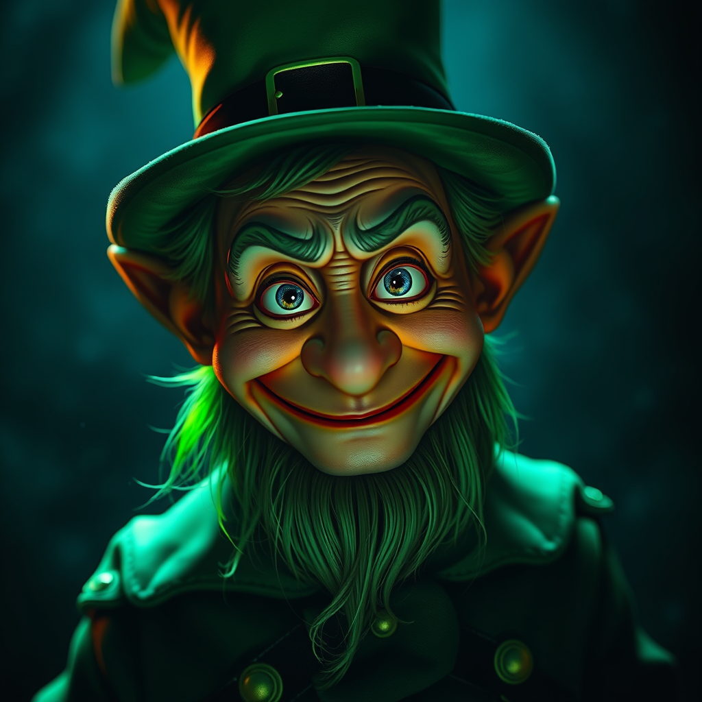 A whimsical leprechaun with a mischievous grin and deep-set wrinkles etched into his face, glowing under ethereal green hues. The scene is bathed in cinematic lighting that evokes a sense of playful mystery, with shadows dancing across a dark, enigmatic background. His eyes twinkle with a hint of wistfulness, adding a touch of melancholy to the vibrant atmosphere.