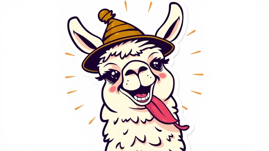 A whimsical llama with a cheeky grin, playfully sticking out its tongue and sporting a quirky hat, comes to life in this lively design. The artwork bursts with vibrant colors and dynamic lines, capturing the llama's joyful and mischievous spirit. Designed as a sticker graphic, it features a clean contour on a white background, showcasing the charming and adorable nature of this playful creature.