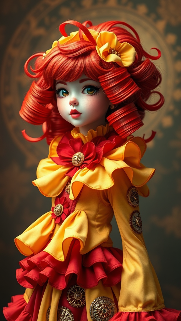 A whimsical magical girl with vivid red hair styled in playful curls, adorned in a colorful ensemble that blends elements of moebius artistry and steampunk influences. Her costume is a striking fusion of light yellow and deep crimson hues, intricately detailed with kintsukuroi-like seams that shimmer with golden accents. The design is both loose and fluid, enhancing her graceful movements, while her outfit showcases stylish, avant-garde features such as layered ruffles, elegant clockwork patterns, and shimmering metallic trims. Her presence is both enchanting and nostalgic, evoking the charm of a sophisticated clown, with an air of mystical allure that captivates and inspires all who gaze upon her.