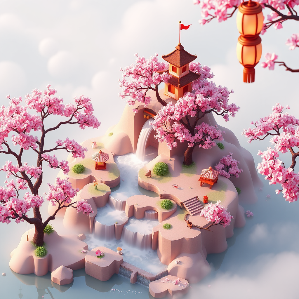 A whimsical matte low poly isometric cherry blossom island featuring gently flowing pink waterfalls, misty air, and warm late afternoon lighting casting soft shadows, inspired by the aesthetics of Fez and Monument Valley, with subtle creative flourishes such as floating lanterns and playful wildlife, a serene scene trending on ArtStation and beautifully rendered in 3D.