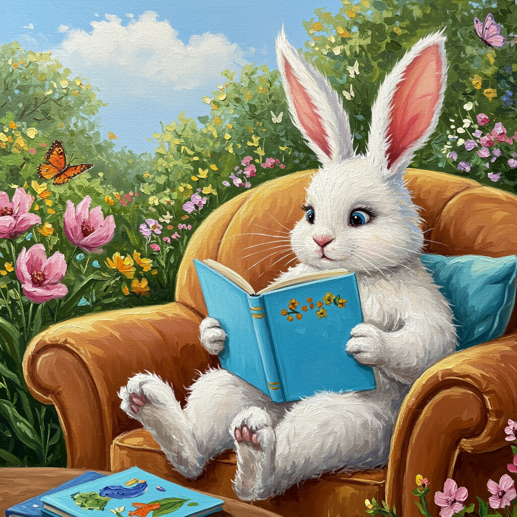 A whimsical oil painting portrays a fluffy white rabbit with long, elegant ears lounging comfortably on a plush sofa, deeply engrossed in a vivid azure children's picture book. The artwork exudes a charming and cozy ambiance, rendered in soft pastel hues that evoke warmth and delight. The close-up composition highlights the rabbit's expressive face, framed by a vibrant garden teeming with blooming flowers in a lively spring setting under a sunlit sky. The gentle, natural light plays across the scene, infusing it with a sense of brightness and vitality. Delicate brushstrokes capture the essence of this enchanting moment, while butterflies flit gently around the rabbit, adding an extra touch of magic and wonder.