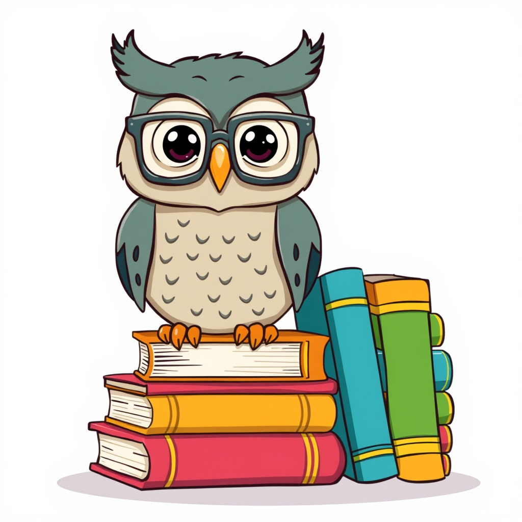 A whimsical owl donning square glasses perched beside a colorful assortment of books, each tome a unique shade, set against a plain white backdrop, illustrated in a charming cartoon style.