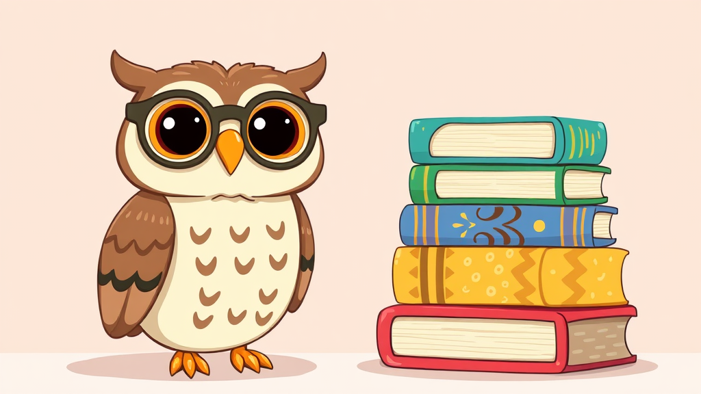A whimsical owl with hexagonal glasses perched beside a stack of vibrantly colored books, each with distinct patterns, set against a soft pastel backdrop in a playful cartoon style.