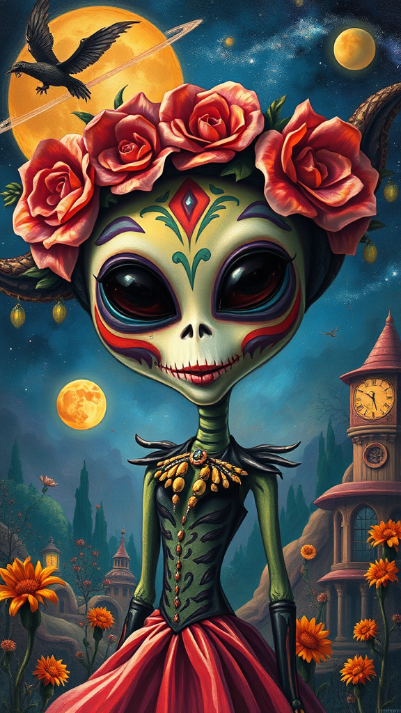A whimsical painting of an alien adorned in vibrant Catrina makeup, captured in the enchanting style of early Disney animation and infused with the elegance of pre-World War II School of Paris. The art showcases detailed character caricatures, with the alien's features exaggerated charmingly. Surrounding it are mysterious, dreamlike backdrops blending cosmic themes with motifs reminiscent of the Day of the Dead. Lively tableaus present scenes bustling with energy and color, each with a hint of mystery and wonder, depicted in rich 32k ultra-high-definition details.