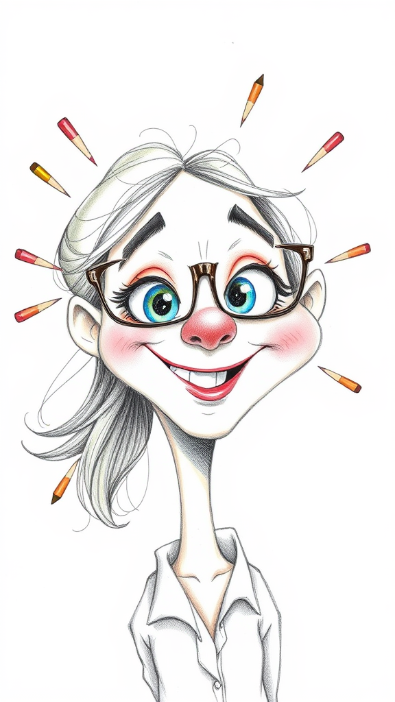 A whimsical pencil drawing of a cute woman in her mid-20s, with color pencils, styled like a Pixar character. She has hilariously oversized features that bring out an exaggeratedly funny essence, set against a clean white background. The composition explores a balance of chaos and creativity, rendered in a playful, elongated 1:2 aspect ratio with an extra touch of stylization to enhance the humor and charm of her expressive caricature.