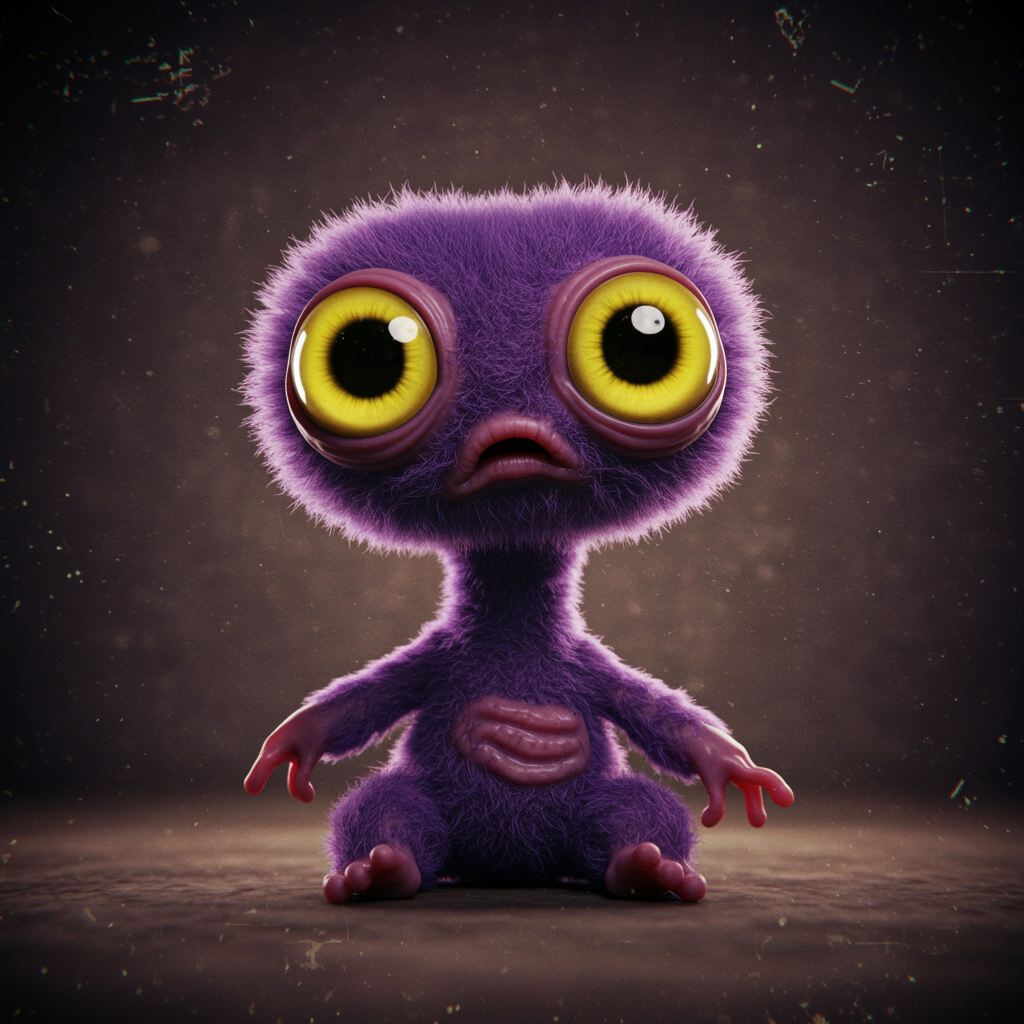 A whimsical, petite, purple, and furry creature with dazzling yellow eyes, featuring a 3D rendering style reminiscent of Pixar and Unreal Engine cinematics. Its intriguing appearance includes intricate details with a playful yet surreal twist: two heads sharing cute, oversized, reflective eyes. The creature's unique anatomy—elongated neck, twisted, abstract fingers, and an extra limb—adds to its quirky charm. Despite its malformed and disfigured features, the cartoonish style brings a toy-like, animated quality. The composition is characterized by a cropped and out-of-frame perspective, lending a sense of mystery and imagination. The creature is surrounded by low resolution and grainy textures, along with curious color distortions, evoking a feeling of a draft or abstract art piece. The image leaves one with a sense of intrigued amusement at its odd proportions and fantastical design.