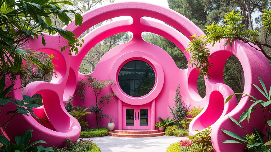 A whimsical pink structure featuring a central circular window, surrounded by flowing pink arches, embodying psychedelic architecture. This vibrant, surreal temple blends organic forms with a kaleidoscope of colors, reminiscent of Verner Panton's style. Its lush, otherworldly garden enhances its enchanting presence. A blend of vegetal and pink zen aesthetics creates a mesmerizing outdoor installation. High-quality architectural art is achieved through curving geometric arches crafted from pink concrete, exuding an elegant, organic design. Inspired by Lee Loughridge, the structure showcases beautiful aesthetic design infused with imaginative creativity.