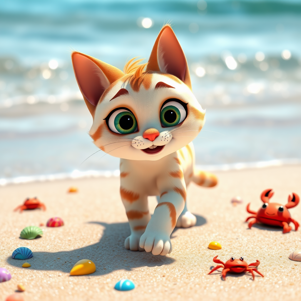 A whimsical Pixar 3D render of a curious cat with expressive eyes and a playful demeanor, exploring a sunlit beach. The sand sparkles under the gentle waves, while colorful seashells and whimsical crabs add pops of color. The cat's movements are fluid and charming, reminiscent of "Finding Nemo," with each paw step synchronized to its delighted expressions. The scene is vibrant with a touch of cartoonish exaggeration, enhancing the cat's endearing antics and bringing the lively beach atmosphere to life.