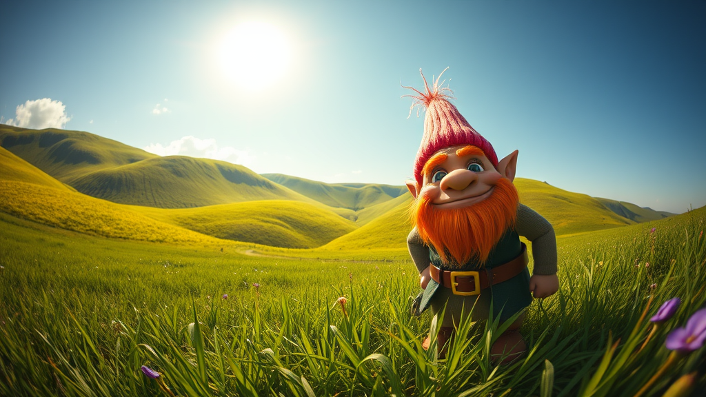 A whimsical portrait captured with a fisheye lens, featuring a friendly troll standing proudly in a lush meadow. Surrounding the troll are rolling, verdant hills under a clear, sunny sky. The scene is bathed in vibrant, lively colors, creating a magical and cheerful atmosphere.