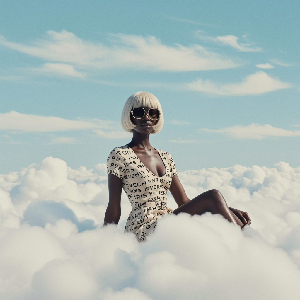 A whimsical portrait captures an eccentric black woman perched gracefully atop billowy white clouds, her commanding presence accentuated by oversized sunglasses and a stunning designer dress featuring the subtle Givenchy logo. Her hair, a striking platinum blonde bob, adds a bold yet sophisticated flair. The backdrop is a dreamy expanse of baby blue sky adorned with delicate cloud formations, creating a serene yet captivating scene. This enchanting image, shot by the artistic eye of Jimmy Marble, is characterized by muted earthy hues and soft, ethereal tones, lending an otherworldly charm to the overall composition.