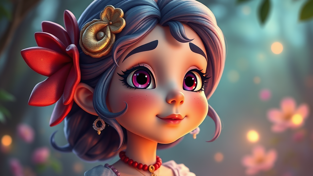 A whimsical portrait of a character, featuring bright colors in a Disney-inspired style, 3D rendered, with ultra-high detail in 8K resolution. The scene is illuminated by soft front lighting and showcases low saturation, giving a gentle, cartoonish feel. The digital painting captures a magical essence, blending the artistic influences of Peter de Sève and Carter Goodrich, and is designed to trend on platforms like ArtStation as standout concept art.
