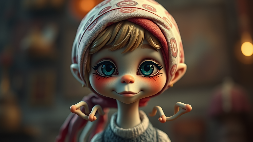 A whimsical portrait of a charming character with a head scarf, styled in a chibi aesthetic, featuring cinematic ambient lighting. The image showcases intricate detail and ornate elements, rendered in 8k UHD HDR quality. The character exhibits unique features like a long neck, extra fingers, and eccentric hands, creating a playful, mutated appearance. The atmosphere is dreamy and slightly surreal, with soft edges and a touch of blur that enhances the otherworldly feel. The image, though high-resolution, includes subtle textures reminiscent of classic digital art, embracing a touch of nostalgic artifacts. The background, out of focus, complements the character with gentle, ambient tones that enhance its quirky, cloned face, adding to the overall delightful and imaginative portrait.