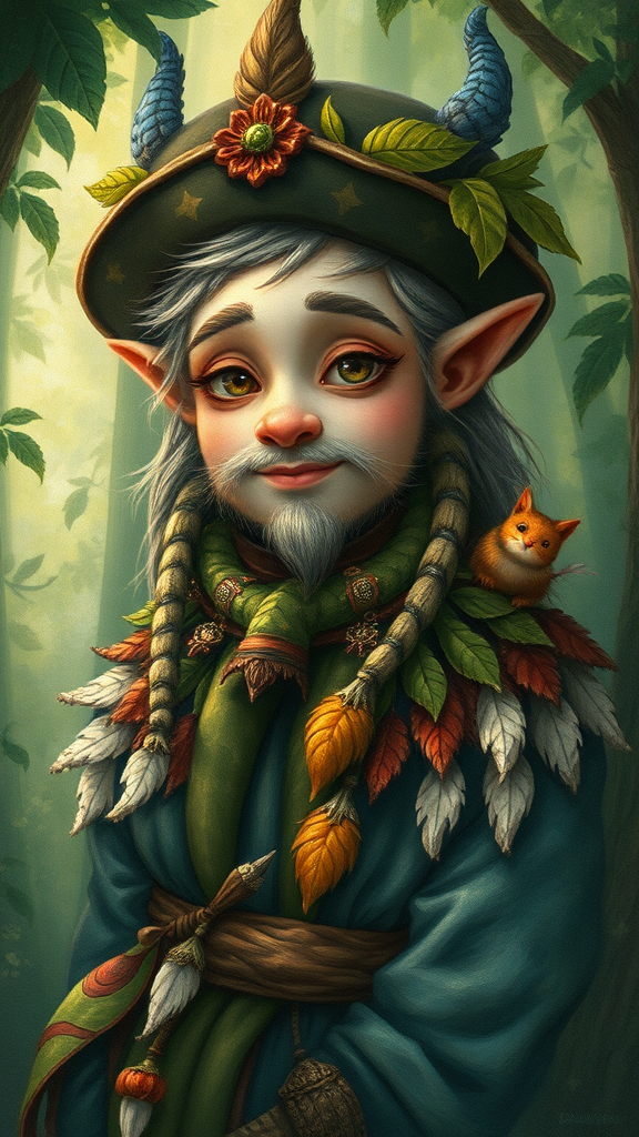A whimsical portrait of a folklore character, such as a cunning trickster or a kind-hearted guardian spirit, in a style reminiscent of John Bauer's work. The character is surrounded by a lush forest setting, with delicate details highlighting their elaborate attire adorned with natural elements like feathers, leaves, and small forest creatures. The scene is painted with a vibrant color palette, where rich greens, deep blues, and warm earth tones create an enchanting atmosphere. Soft, diffused lighting filters through the canopy, casting ethereal patterns that enhance the scene's dreamy quality. The character's mischievous eyes twinkle with hidden knowledge, inviting viewers into the magical world they inhabit.