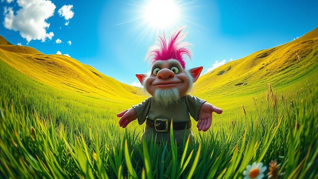 A whimsical portrait photo captures a troll standing amid a lush, verdant meadow, framed by gentle rolling hills under a radiant blue sky. The scene is viewed through a fisheye lens, accentuating the troll's quirky features and oversized hands. Bright, vibrant colors illuminate the landscape, with sunlit grasses waving gently in the warm breeze, creating a lively, enchanting atmosphere.