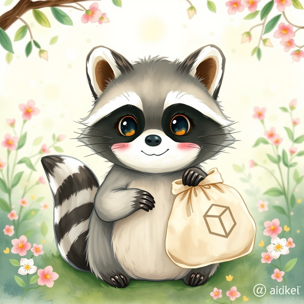 A whimsical raccoon character is depicted, exuding charm with its endearing and playful demeanor. Its fur is rendered with delicate, fine lines, reminiscent of the handmade quality seen in Studio Ghibli's beloved characters. The raccoon's wide, expressive eyes and gentle smile draw inspiration from kawaii style illustrations, emphasizing its lovable essence. Its fur is painted with soft watercolor effects, blending seamlessly to create a natural, yet magical appearance. In one paw, the raccoon clutches a cloth bag, its surface adorned with the subtle outline of a cube symbol, hinting at a mysterious treasure within. The scene captures a serene moment in a lush, imaginative world, filled with delicate flora and dappled light, blending traditional Japanese art influences with playful, modern touches.