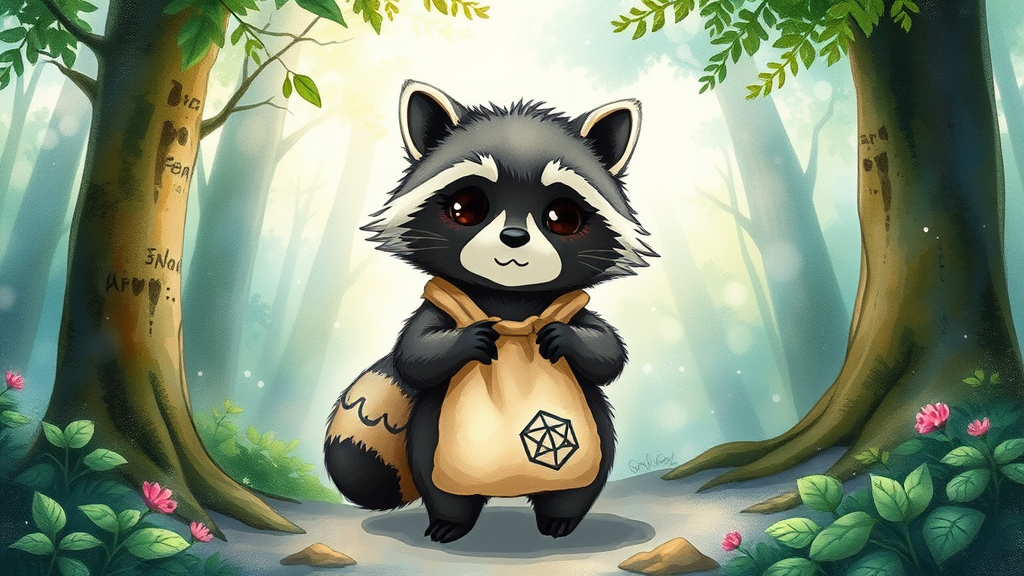 A whimsical raccoon stands in a serene, enchanted forest resembling a scene from a Studio Ghibli film, its plush fur intricately detailed with delicate, handmade lines that capture the essence of kawaii art. The raccoon, with an expression of curious mischief, clutches a cloth bag adorned with a subtle, mystical cube symbol. The background is a lush tapestry of watercolor effects, blending hues of soft greens and blues, with hints of dappled sunlight filtering through the leaves. The raccoon’s eyes sparkle with playful intelligence, inviting viewers into a world where nature and fantasy coexist in harmony and whimsy.