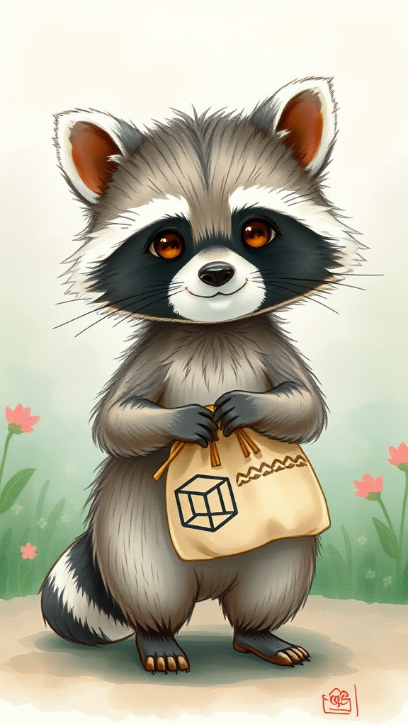 A whimsical raccoon stands poised, with a gentle expression and mischievous glint in its eyes, embodying the enchanting spirit of Studio Ghibli's art style. Its fur is rendered in delicate, fine lines that ripple with lifelike texture, and subtly shaded with soft watercolors that blend harmoniously. The raccoon clutches a dainty cloth bag, woven with patterns reminiscent of traditional Japanese textiles, bearing a distinctive cube symbol that hints at hidden mysteries. The scene captures the essence of kawai, exuding an endearing charm through the raccoon's delicate features and captivating presence, set against a backdrop of lush, hand-painted landscapes that radiate warmth and imaginative wonder.