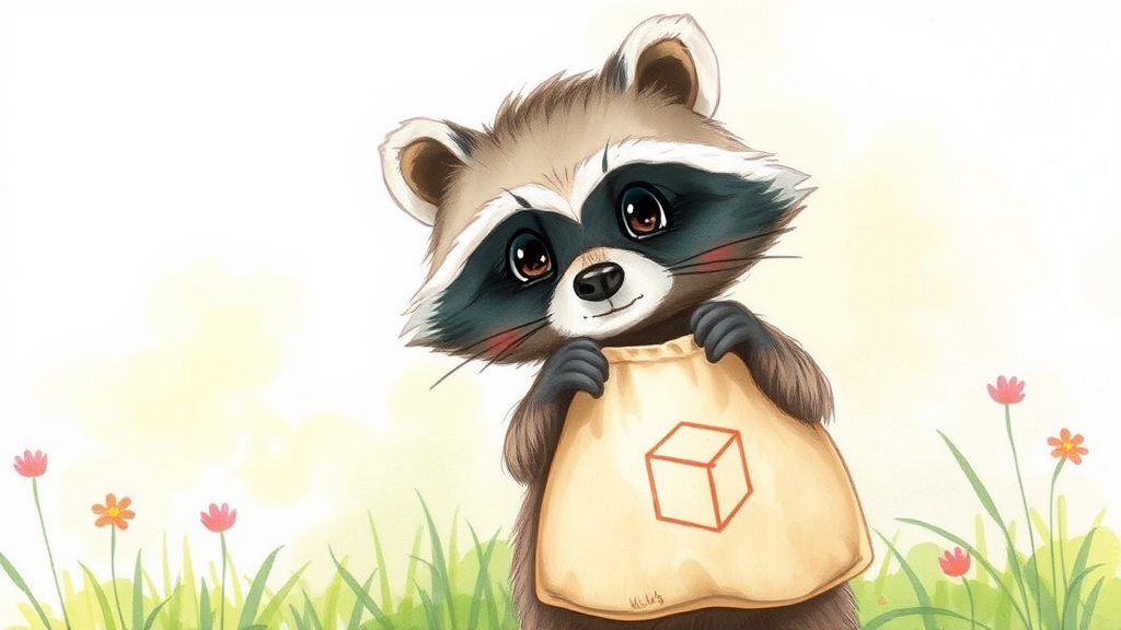 A whimsical raccoon, with its fur rendered in delicate watercolor shades, holds a charmingly textured cloth bag. The bag, slightly oversized for the raccoon's tiny frame, displays an abstract cube symbol. The raccoon's lively eyes and animated expression bring a sense of curiosity, reminiscent of a playful spirit exploring a magical world. The background features a serene nature scene, with soft pastel hues blending effortlessly together, echoing the signature handmade line work and gentle, dreamlike quality that Studio Ghibli is known for. Fine line detailing and a touch of kawaii charm make the raccoon an endearing character, as if plucked from an enchanting, animated tale.
