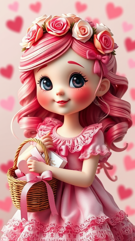 A whimsical representation of Valentine's Day as an adorable girl, her appearance vibrant and charming, with rosy cheeks and heart-shaped freckles. She's adorned in a playful ensemble of pinks and reds, featuring a dress adorned with delicate lace and ribbons. Her hair cascades in soft waves, shimmering with hints of pastel hues, and a crown of miniature roses rests atop her head. Her eyes sparkle with joy, reminiscent of candy hearts, and her smile radiates warmth and love. She carries a small basket filled with love notes and tiny gifts, spreading joy and affection wherever she goes, embodying the essence of love and kindness.