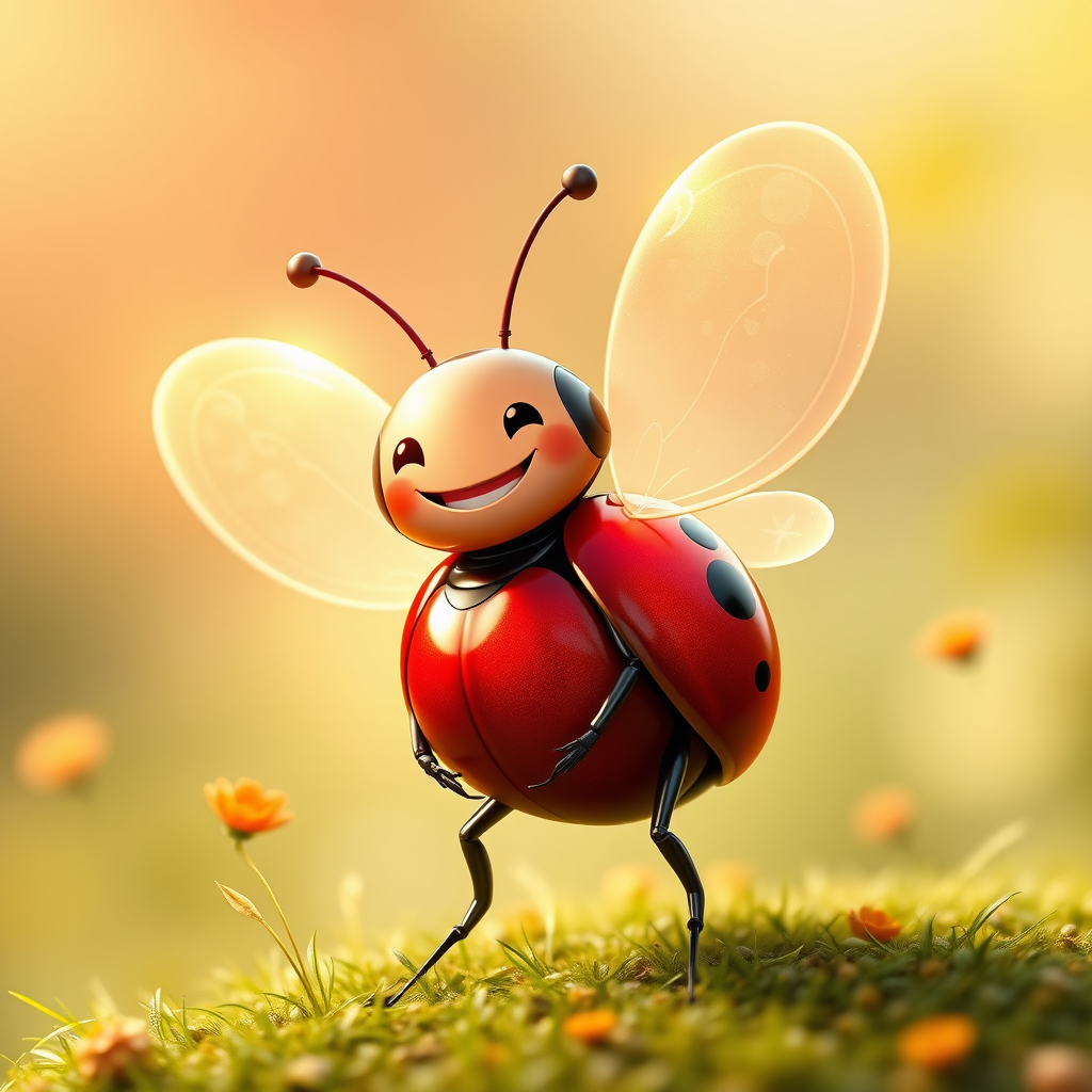 A whimsical robo-ladybug with a radiant, animated grin, its shell gleaming in vibrant hues of red and black, emitting warmth and joy as it flutters gently, spreading happiness wherever it lands.