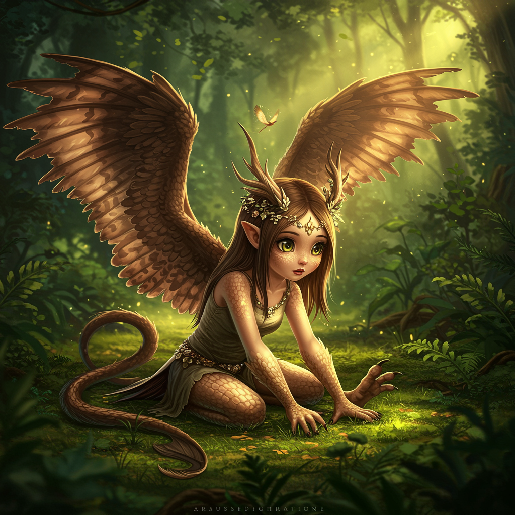 A whimsical scene features a fantasy-style girl with an endearing face sitting in a verdant forest, her large dragon wings spreading around her. Her skin holds a realistic, textured quality, shimmering with hints of magic. Amidst the foliage, her wings showcase patterns reminiscent of eagle feathers, while embodying the grace of falcon wings. She toys with the ground using her raptor-like legs, positioned in a komodo-inspired stance. Her large, expressive anime eyes convey curiosity and wonder. The scene captures the beauty of nature intertwined with mythical elegance, surrounded by a lush, magical landscape, enhanced with a topaz gigapixel upscale.