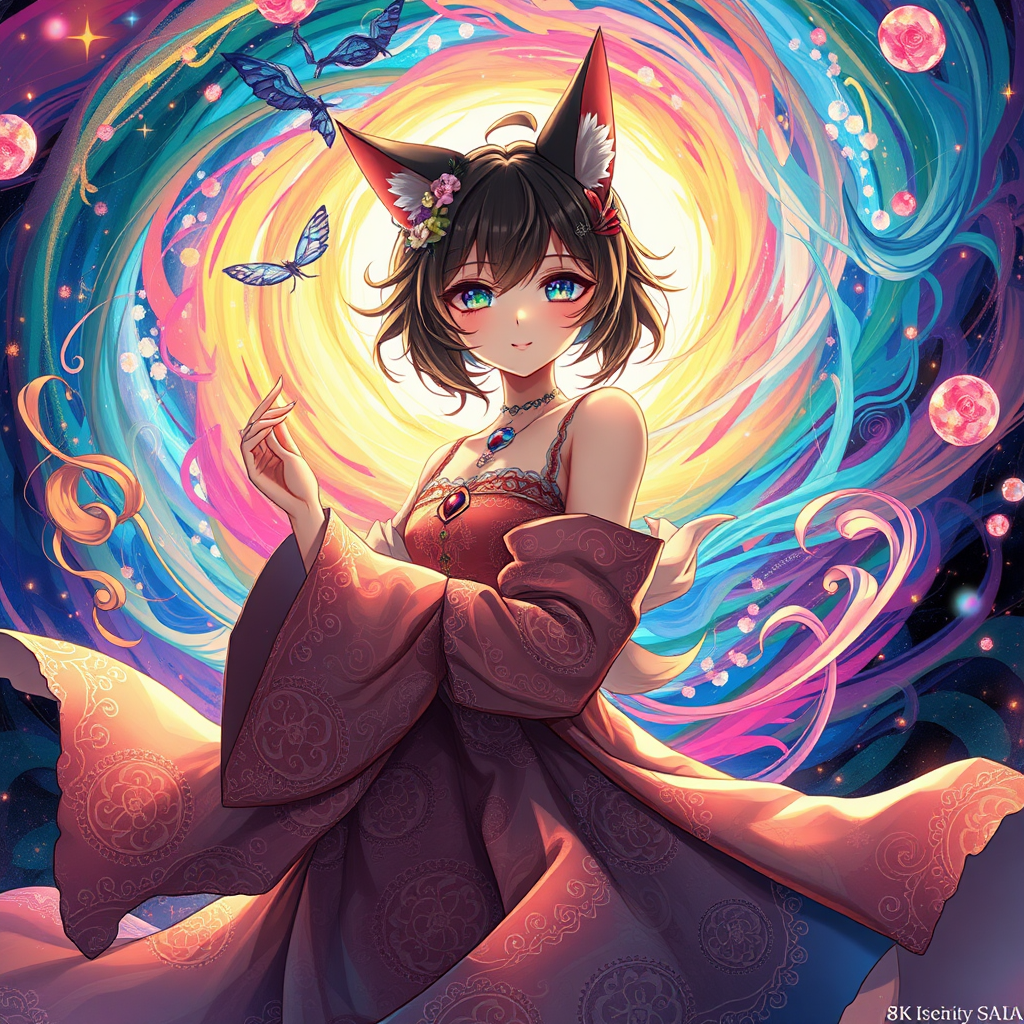 A whimsical scene features a woman with feline ears and a flowing dress adorned with intricate patterns, set against a vibrant, swirling backdrop that bursts with color. Her eyes glimmer with an otherworldly light, capturing the essence of anime fantasy. The setting evokes a dreamlike quality, reminiscent of Yuumei's ethereal style, blending beautifully detailed designs with the allure of onmyoji lore. The artwork is rendered in painstaking detail, creating a mesmerizing 8K digital tapestry that invites viewers to explore its fantastical depths, offering a unique blend of elegance and enchantment.