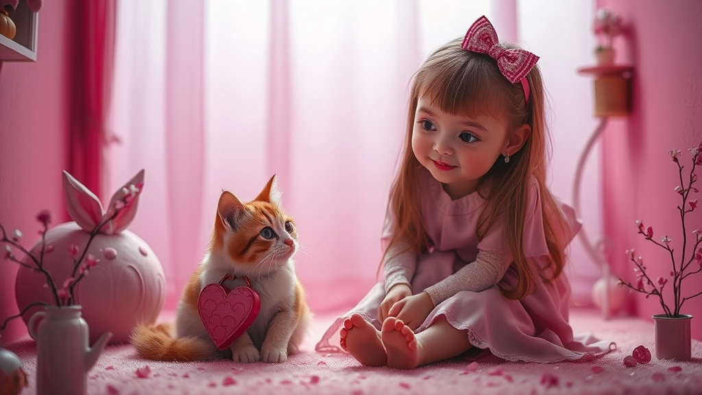 A whimsical scene featuring a cat and a girl in a vividly pink-hued environment, captured with a cinematic flair in ultra-high definition, showcasing intricate details and a breathtakingly high quality visual experience. Subtle creative elements add charm and depth to the serene atmosphere.