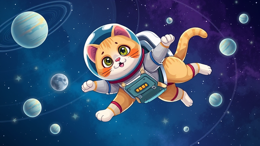 A whimsical scene featuring a cat in a sleek astronaut suit playfully floating among the stars, its eyes wide with wonder as it drifts through the cosmos, accompanied by a backdrop of swirling galaxies and distant planets, the deep blues and purples of space contrasting with the cat's bright space gear, capturing a sense of feline curiosity and adventure in the vast, mesmerizing expanse of the universe.
