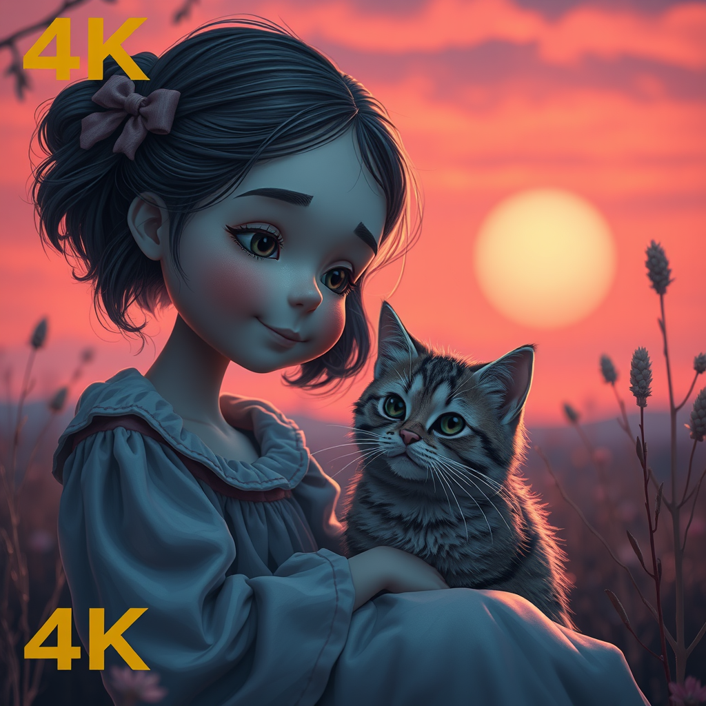A whimsical scene featuring a girl and her cat, set against a pink-hued sunset, captured in stunning 4k resolution with intricate details, evoking a cinematic atmosphere of warmth and fantasy.