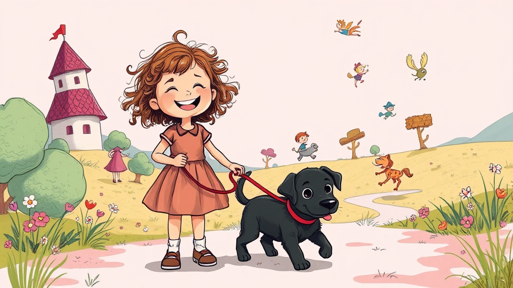 A whimsical scene featuring a joyful little girl with curly hair holding a leash of a playful black puppy, sketched in the style of Eve Ventrue and Patrick Brown, capturing the innocence of childhood with Alain Laboile's touch. They are surrounded by a vibrant and imaginative landscape with a pink hue, where cartoonish and lively characters frolic in the background, all rendered with a sense of playful charm and adventure.