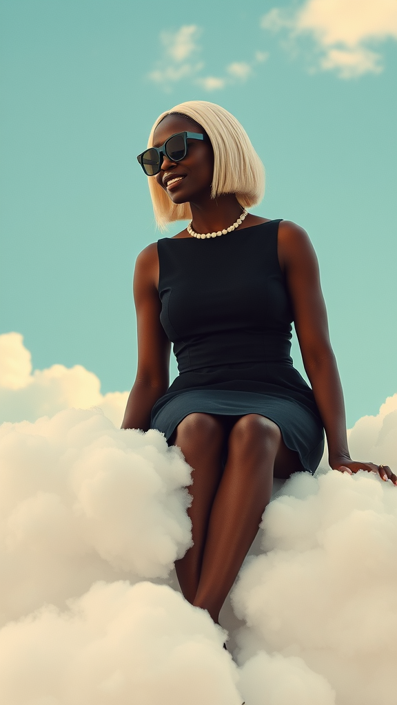 A whimsical scene featuring a stylish Black woman perched gracefully on soft, fluffy white clouds. She dons oversized, chic sunglasses and a striking designer dress from Givenchy, subtly displaying the brand's iconic logo. Her hair is styled in a sharp, platinum blonde bob that contrasts beautifully against the serene backdrop. The sky is a calming baby blue, adorned with delicate cloud formations that add to the dreamlike atmosphere. Captured in the signature style of Jimmy Marble, the image uses muted, earthy colors and soft tones, creating a harmonious and artistic composition.