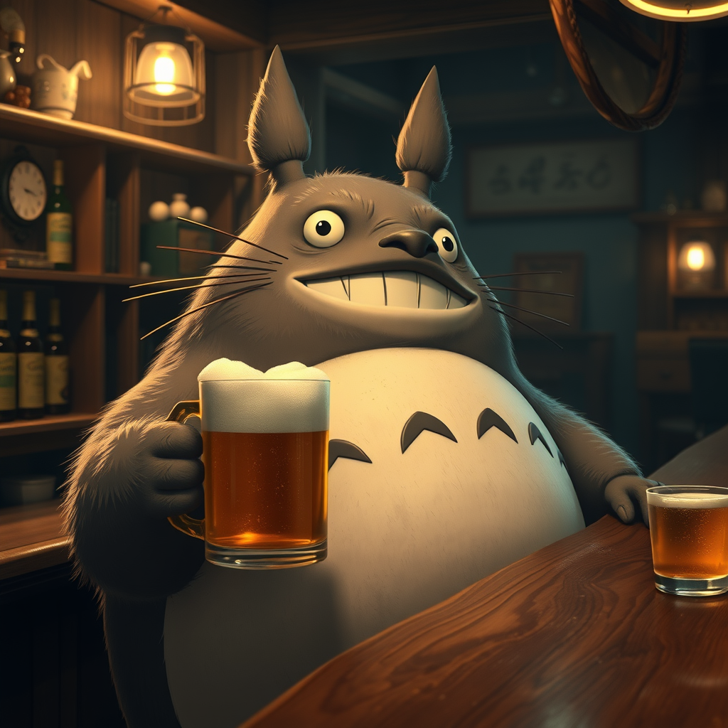 A whimsical scene featuring a tipsy Totoro, relaxed at a dimly lit bar, holding a frothy mug of beer. The setting exudes a warm, cinematic glow reminiscent of Studio Ghibli's enchanting style. In this lively atmosphere, Totoro, with a cheerful and slightly flushed expression, interacts with the rustic charm of the bar. Soft, ambient lighting accentuates the texture of his fur and the polished wood of the bar, while a hint of animated magic lingers in the air, adding a playful touch to the photorealistic portrayal.