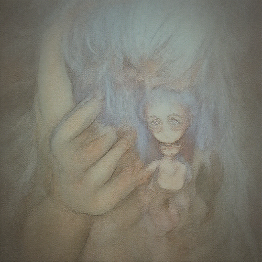A whimsical scene featuring a young girl and an enormous ethereal ghost, inspired by the style of Chiho Aoshima, rendered in 16k with vibrant UHD and HDR quality. The girl's face is duplicated and cross-eyed, with exaggerated features like extra fingers and distorted hands adding a surreal touch. The composition is intentionally cropped, with some elements out of frame, reminiscent of an imaginative, dream-like atmosphere. The scene incorporates subtle textures and colors, with hints of jpeg artifacts giving it a slightly vintage feel. Details like text, signatures, watermarks, or trademarks are absent, focusing purely on the visual narrative. A playful exaggeration of proportions, such as a long neck on the girl or humorously peculiar facial expressions, contributes to the artistic fantasy.