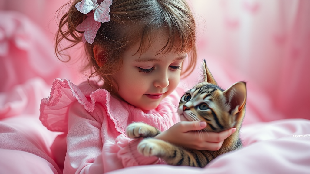 A whimsical scene featuring a young girl and her charming cat, surrounded by a dreamlike pink ambience, captured in striking cinematic 4k quality with intricate details emphasizing their playful interaction.
