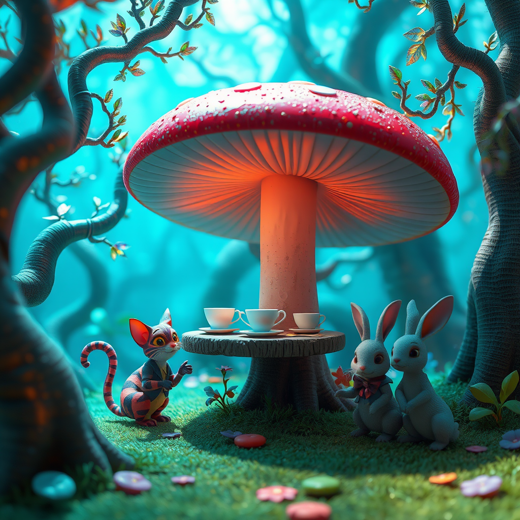 A whimsical scene inspired by Alice in Wonderland unfolds in a magical, fairy tale forest. Trees twist and curve impossibly, their leaves shimmering with iridescent colors. A charming, oversized mushroom serves as a table for a miniature tea party, complete with delicate teacups and a tiny teapot. Fantasy creatures, like a Cheshire cat with luminescent fur and a dapper rabbit in a waistcoat, gather around, their expressions full of wonder. The atmosphere glows with an ethereal light, casting playful shadows on the ground. This awe-inspiring, enchanting world is captured through a 3D rendering with vibrant colors and intricate details, enhanced by Octane Render and Adobe Photoshop to heighten the beauty and cuteness of the scene.