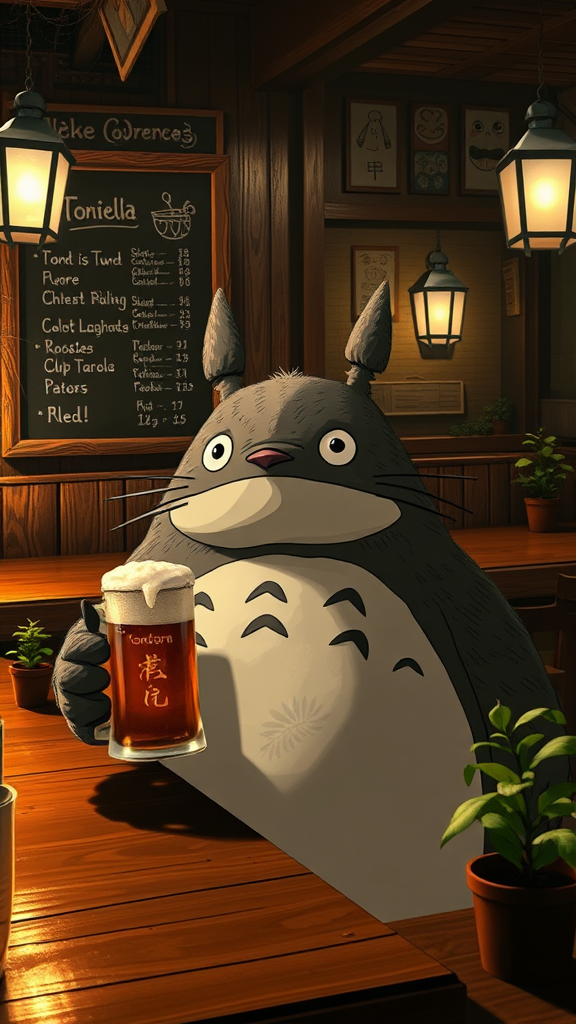 A whimsical scene of an inebriated Totoro, slouched slightly at a cozy, dimly lit tavern, clutching a frothy mug of craft beer. Studio Ghibli's trademark photorealistic style brings life to the textured fur and expressive eyes of Totoro, while the cinematic lighting casts a warm, inviting glow across the polished wooden surfaces and softly glowing lanterns. The background features a chalkboard menu with playful, hand-drawn illustrations, and small potted plants add a touch of nature to the enchanting, animated atmosphere.