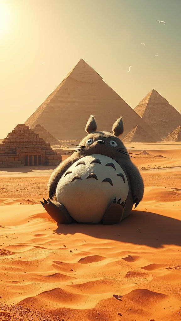 A whimsical scene unfolds as a giant friendly creature resembling Totoro lounges peacefully amongst the majestic pyramids of Giza, its fluffy form casting a playful shadow against the timeless sands. The desert sun bathes the landscape in a warm golden glow, where ancient monuments stand in harmonious contrast to the enchanting creature. A gentle breeze stirs as playful dust devils dance around, and the air is filled with a sense of wonder and nostalgia, inviting you to step into a world where mythical beings and ancient history meld seamlessly.