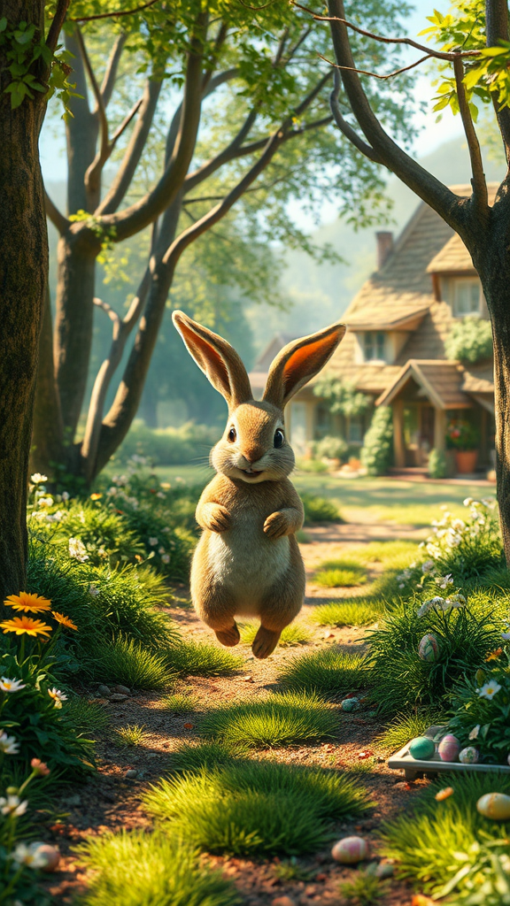 A whimsical scene unfolds as a lifelike Peter Cottontail, with intricate textures and vibrant colors, hops joyfully down a sunlit bunny trail through a lush, enchanted forest. The trail is dotted with playful elements: delicate wildflowers and colorful Easter eggs nestled amongst the foliage. In the distance, a quaint village prepares for Easter, with tiny cottages exuding warmth and charm. The atmosphere is a delightful blend of Beeple's detailed craftsmanship and Studio Ghibli's magical storytelling, infused with gentle breezes that ripple through the trees, capturing the spirit of spring and renewal.