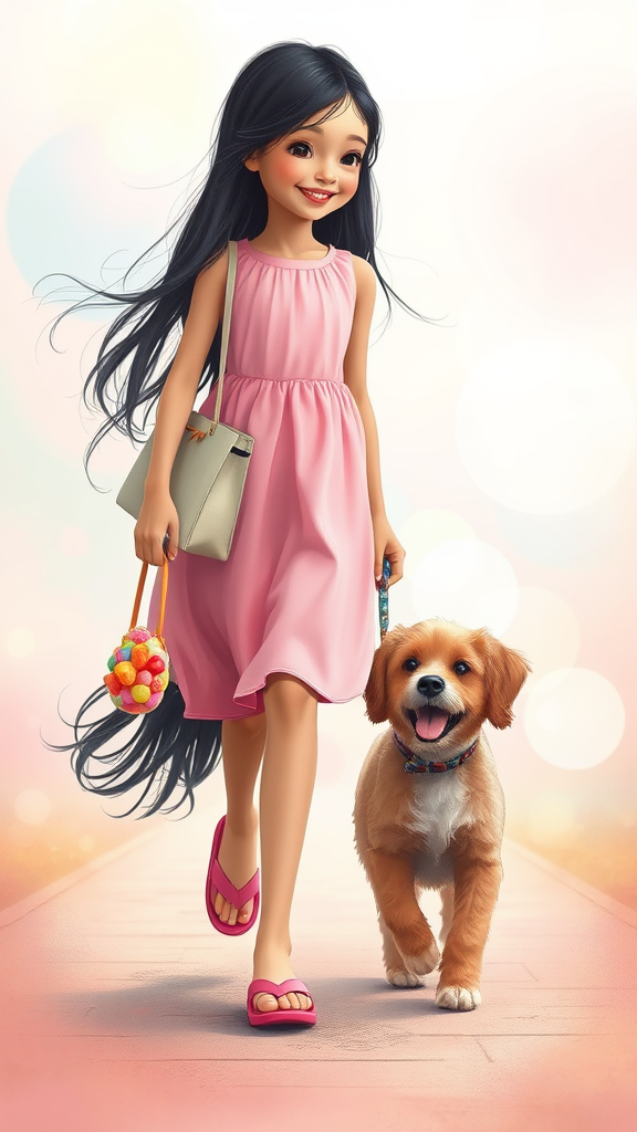 A whimsical scene unfolds as a young girl with long, flowing black hair wears a charming pink dress and bright sandals. She strolls happily with her faithful pet dog, who sports soft brown fur and a playful bounce in his step. In her hand, she carries a colorful bag filled with sweet candies. The background is awash in soothing pastel colors, creating a dreamy atmosphere. As they wander, the girl's laughter mingles with the dog's joyful barks, bringing the serene setting to life with warmth and delight.