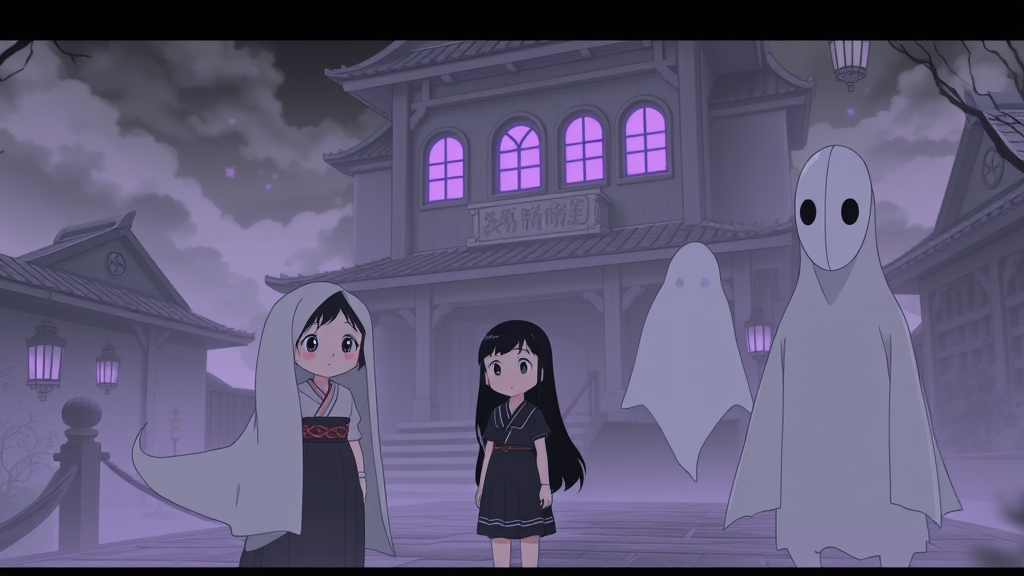 A whimsical scene unfolds as characters from Spirited Away are depicted in a monochrome palette with subtle purple accents. Chihiro, shrouded in grayscale with hints of lavender in her eyes, stands in awe. Haku, ethereal in shades of black and white, has a soft purple glow to his dragon scales. No-Face, mysterious and ghostly, features delicate violet highlights on his mask. The mystical bathhouse looms in the background, its architecture outlined in gray with touches of amethyst adding depth to the windows and lanterns. This atmosphere, both surreal and enchanting, bridges the worlds of fantasy and reality.